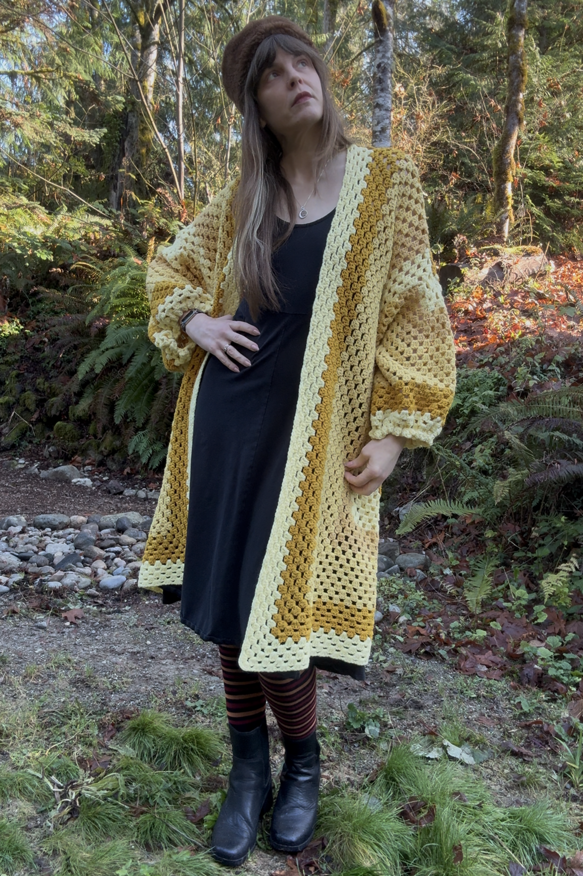One of a kind upcycled vintage blanket cardigan. Gold, pale yellow and creamy colors unite for this delight! Sleeves gathered at hem with elastic. This is truly one regal piece, and can accommodate many sizes. Please see measurements below for details.
