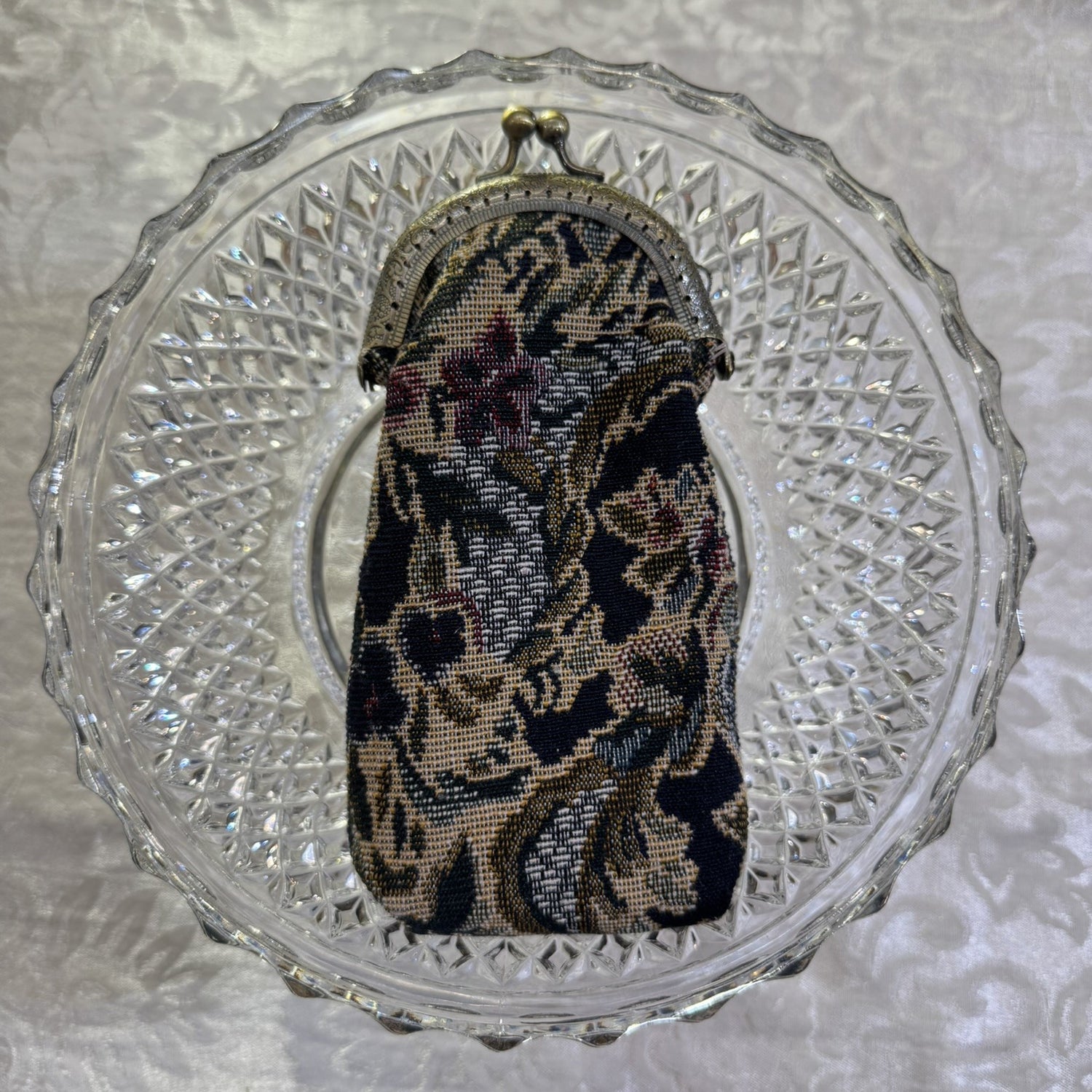 Our lovely little eyeglass pouches will help you create a spectacle of style! Each one is handmade with vintage and secondhand materials, fully lined with a layer of batting enclosed to keep the contents safe. Metal kiss clasp frames are meticulously attached by hand with a special heavy duty abrasion-resistant thread. These are our best sellers! Customers have told us that they use them for storing all sorts of things- art supplies, dice, you name it!