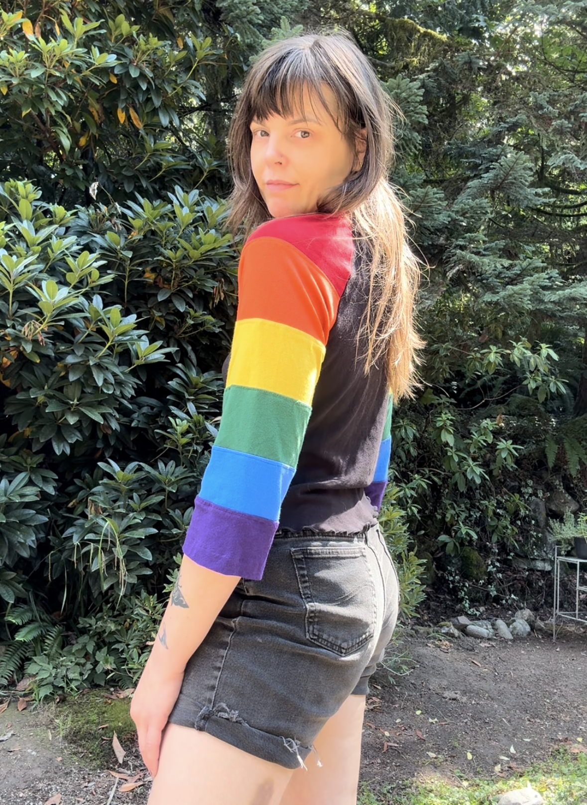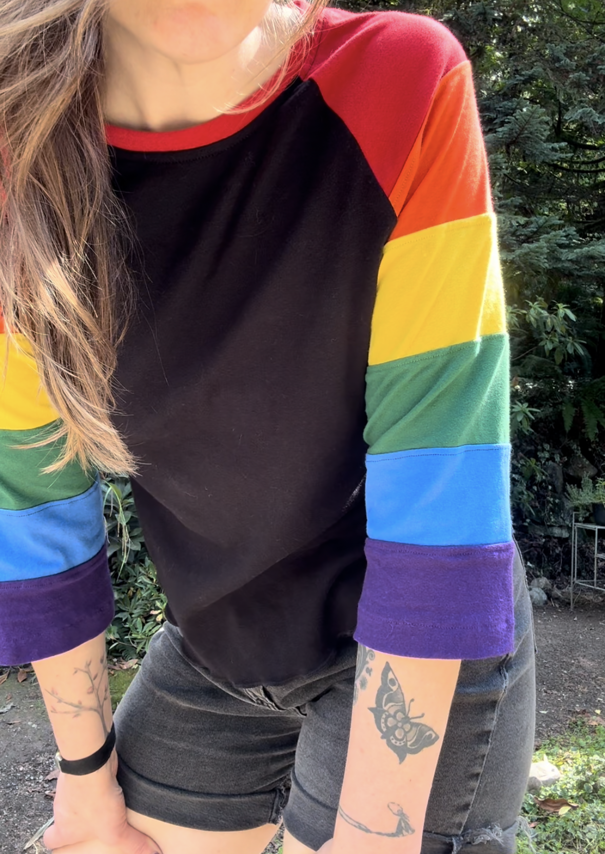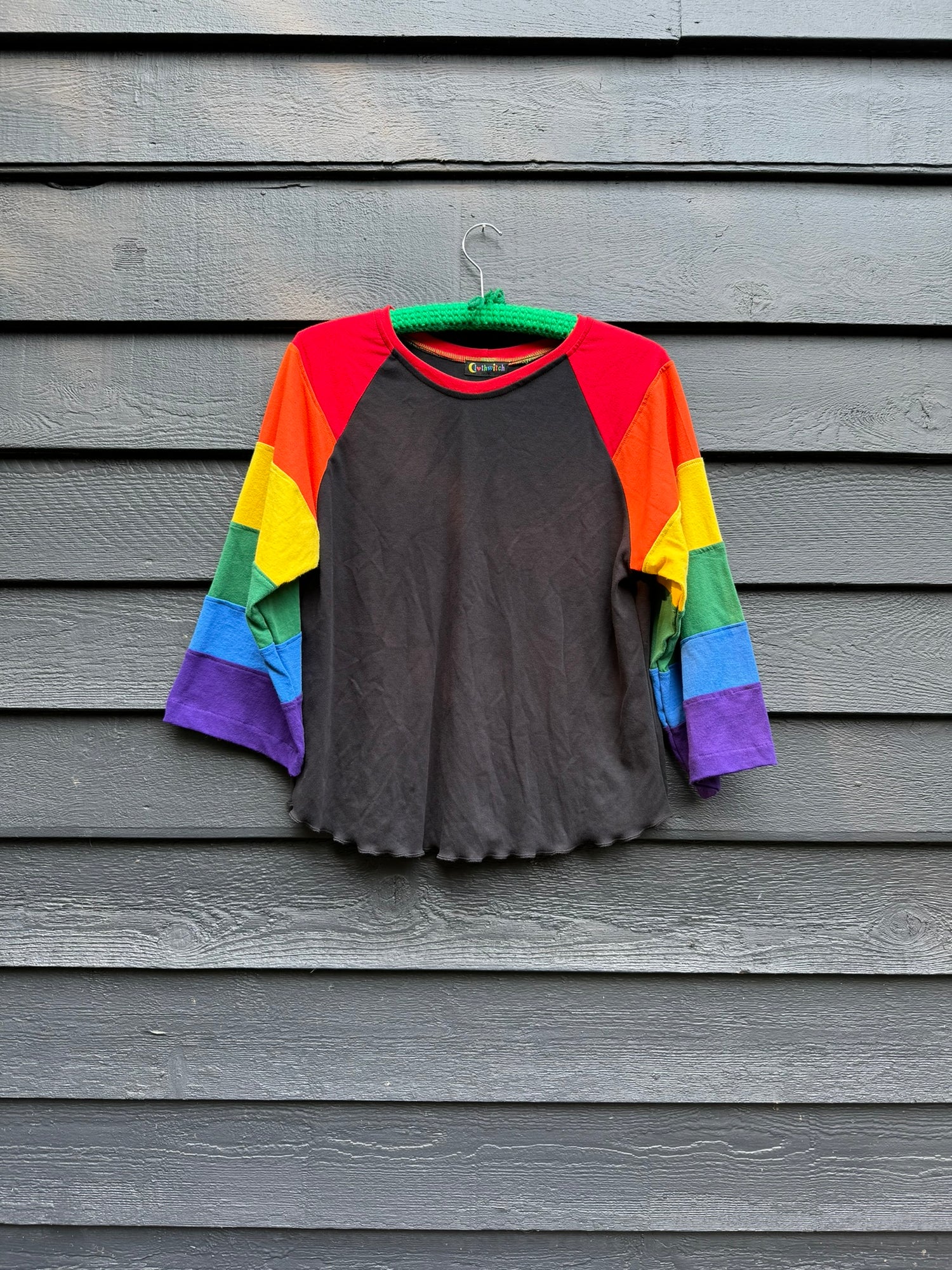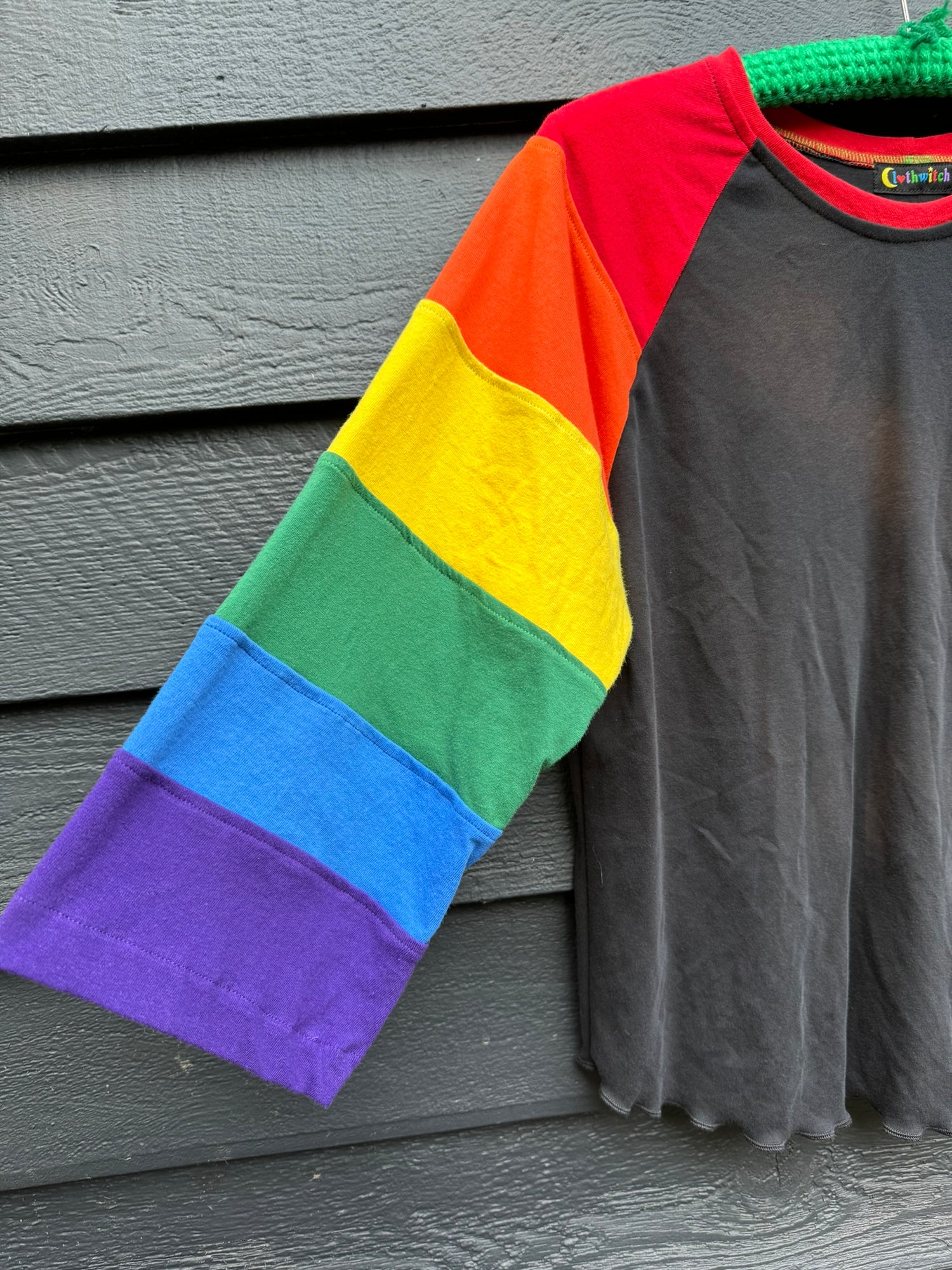 This raglan top features rainbow color blocked 3/4 length sleeves on a black bodice. Each piece is one of a kind and made with 100% upcycled tee shirts.